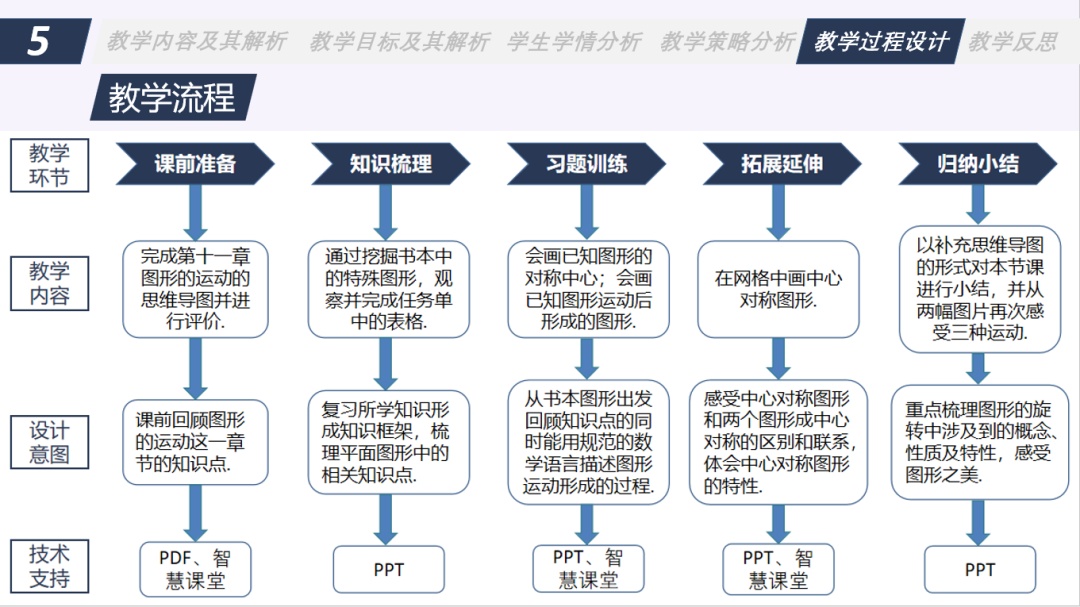 汇贤中学教育集团的上海外国语大学附属奉贤实验中学张易安老师从教学内容及其分析、教学目标及其分析、学生学情分析、教学策略分析、教学过程设计、教学反思六部分对《第十一章图形的运动专题复习》进行说课。张老师从书本图形中挖掘出图形存在的平移、旋转和翻折等运动,探索从复杂的图形中剥离出其相关的图形及其性质。张老师使用关注单位整体,把握知识联系,重视图形探究,回归书本实例,注重学法指导,渗透学科素养这三个复习策略,对本节复习课进行教学,也增强了学生自主学习、合作交流的能力。