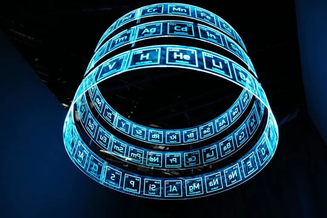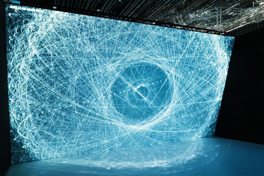 在“隐藏的维度”,观众抬头即可看到从空中垂降的元素瓶,以及来自不同大洲的陨石残片。而紧接着的《天体乐章》超大圆形展厅则让每一位观众叹为观止。艺术家安久、音乐制作人钱正昊、数字艺术家李昊哲三人通力合作,邀请观众通过行走交织出星体的位置关系、敏感变化和化学构成。观众走进这个空间,就能看到围绕在自己脚边的属于自己的星轨。