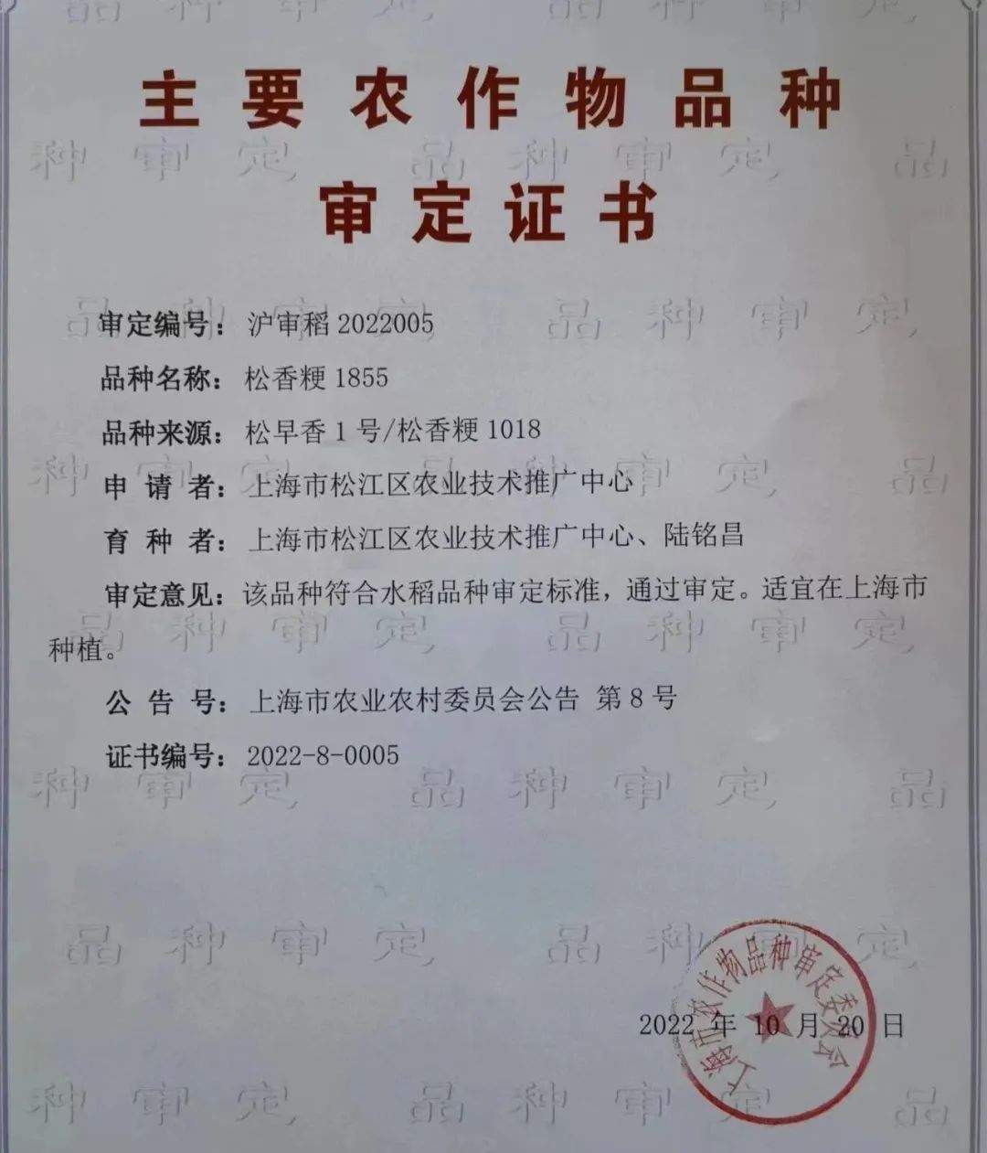 松江优质稻米“家族”又添新成员。近日,由松江区成功育成的中晚熟粳稻品种“松香粳1855”,正式通过上海市农作物品种审定。