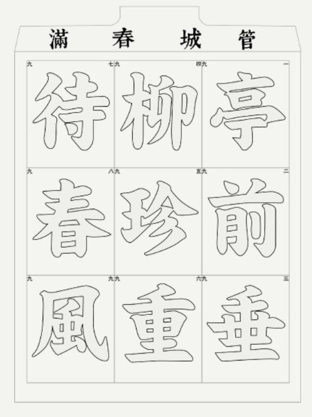 在故宫养心殿后殿,挂有一幅图,上书“管城春满”,下面如九宫格一般,从右到左,写有九个双钩空心字:“亭前垂柳珍重待春风”,每个字(繁体字)都是九笔。读起来诗不诗、词不词,如果不懂民俗,可能会一头雾水。