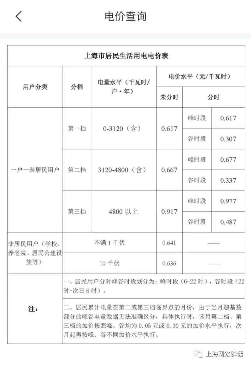 经查询,在目前上海市居民生活用电电价表中,一户一表居民用户按照阶梯递增,其中第一档的未分时电价为每度0.617元,分时电价为峰时段每度0.617元,谷时段每度0.307元;第二档的未分时电价为每度0.667元,分时电价为峰时段每度0.677元,谷时段每度0.337元;第三档的未分时电价为每度0.917元,分时电价为峰时段每度0.977元,谷时段每度0.487元。相关数据与网传截屏所称完全不同。