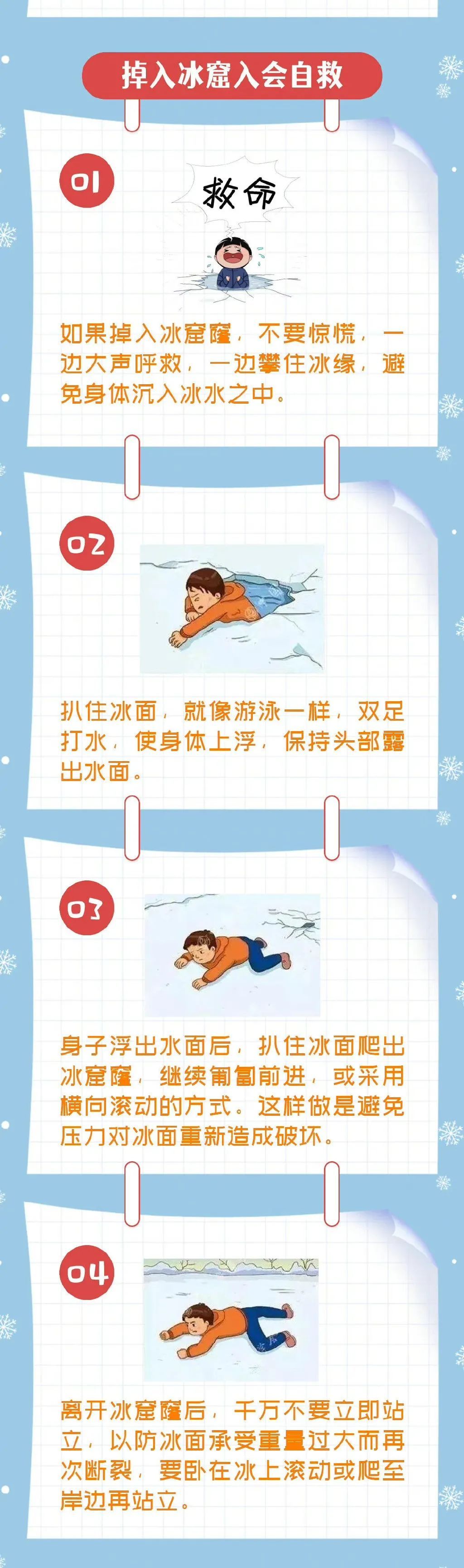 入冬以来,不少地区出现了水面结冰现象,但由于气温起伏较大,冰面薄厚不一,导致其承载能力无法估量,孩子在“野冰”上活动危险性大,如何避免破冰落水,在冰面落水如何施救或自救?这些提示请收好——