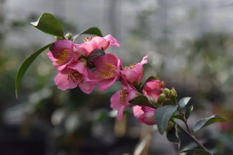 ·束花茶花品种群,主要由尖连蕊茶、琉球莲蕊茶等连蕊茶组和毛蕊茶组资源为亲本培育而来。其典型特征是开花繁密,多枚花蕾顶生和腋生,成簇或成束开放。比如上海植物园培育的'上植华章'、'玫玉'、'玫瑰春'等品种,在城市街头大放异彩。