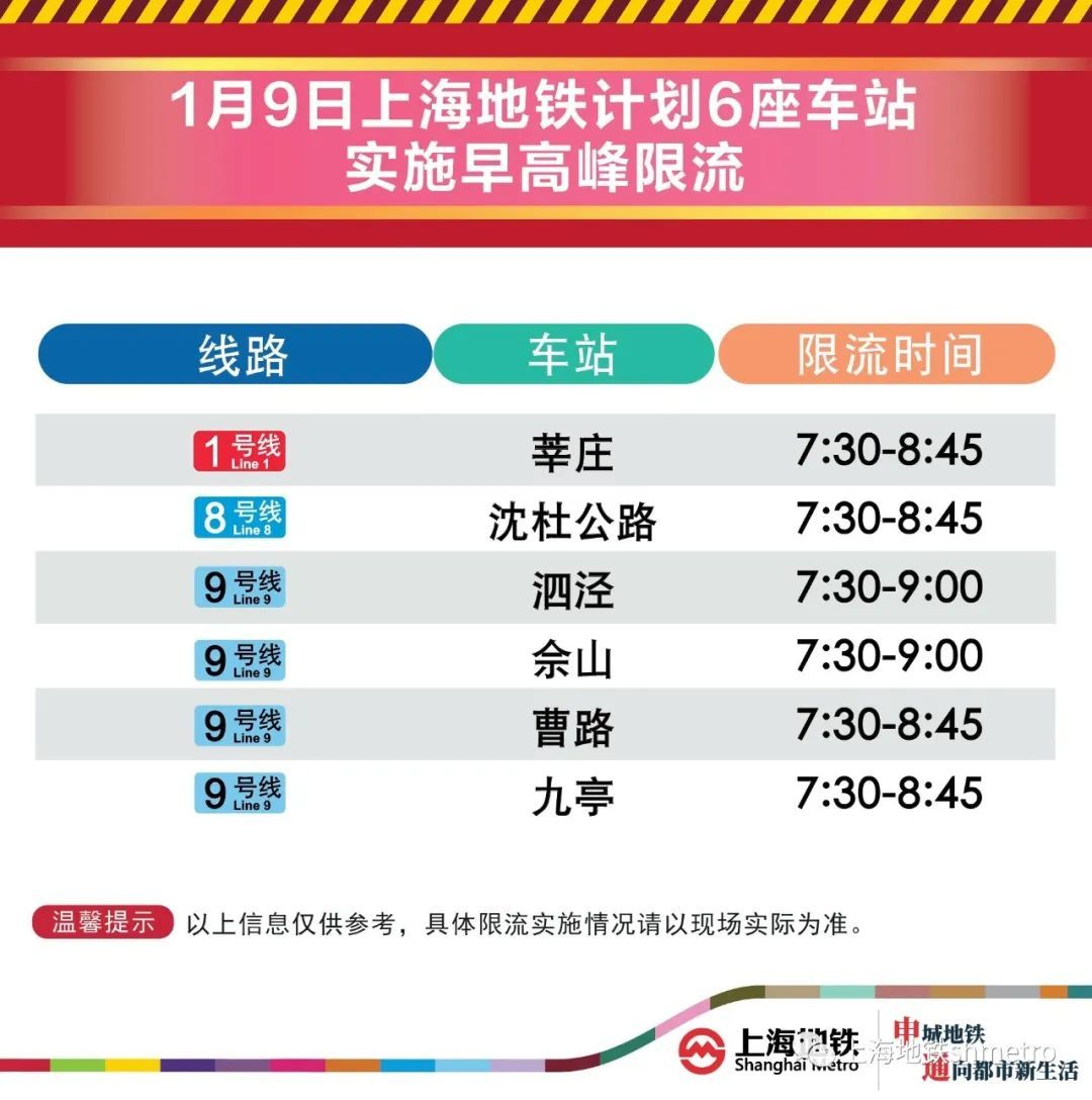 1月9日,上海地铁早高峰限流措施将继续实施,届时将有6座地铁站早高峰计划限流。