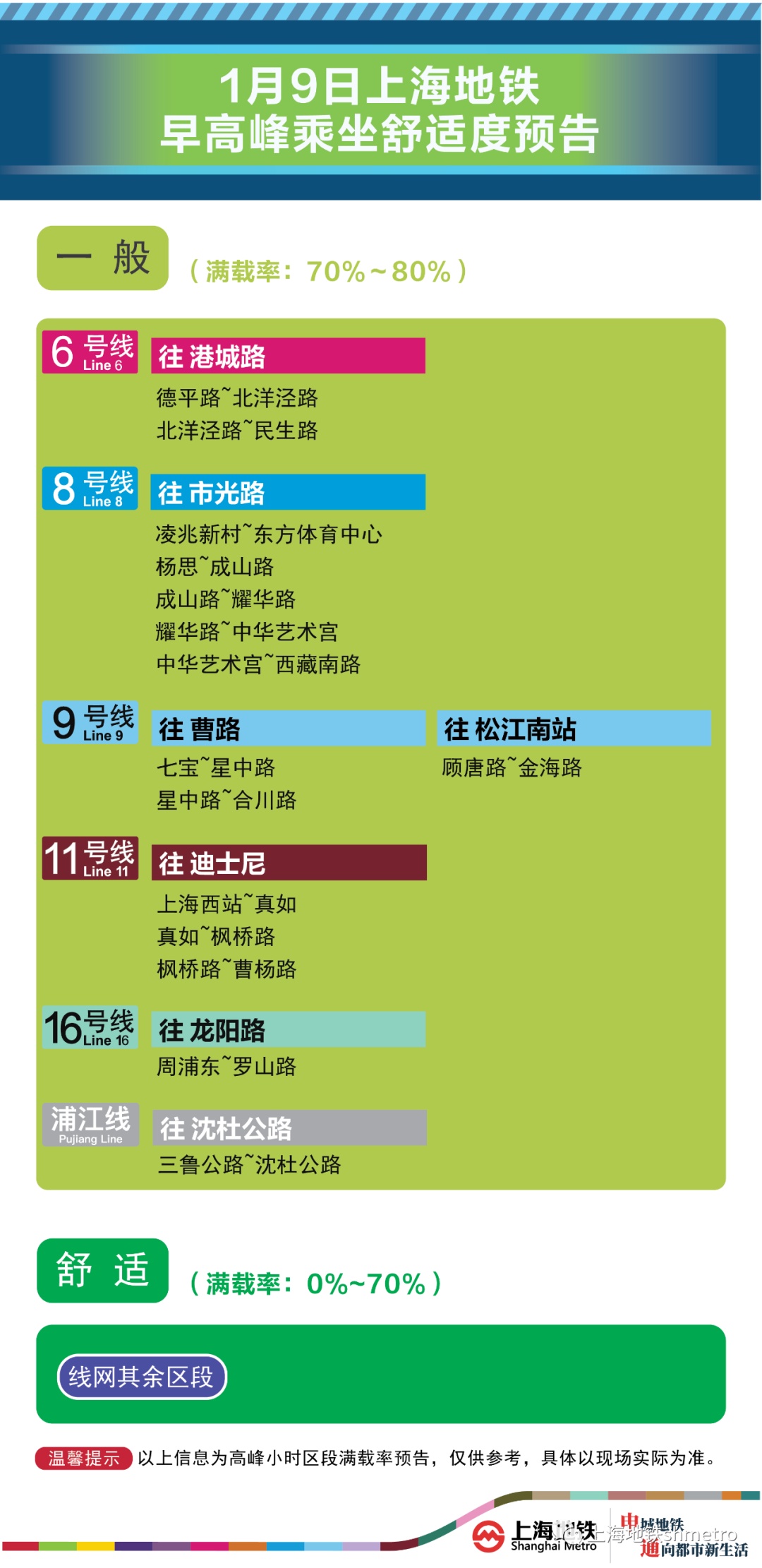 为提升上海地铁早高峰期间出行服务水平,提升乘客乘坐体验,上海地铁向乘客提供乘坐舒适度预告,方便乘客提前做好出行准备。