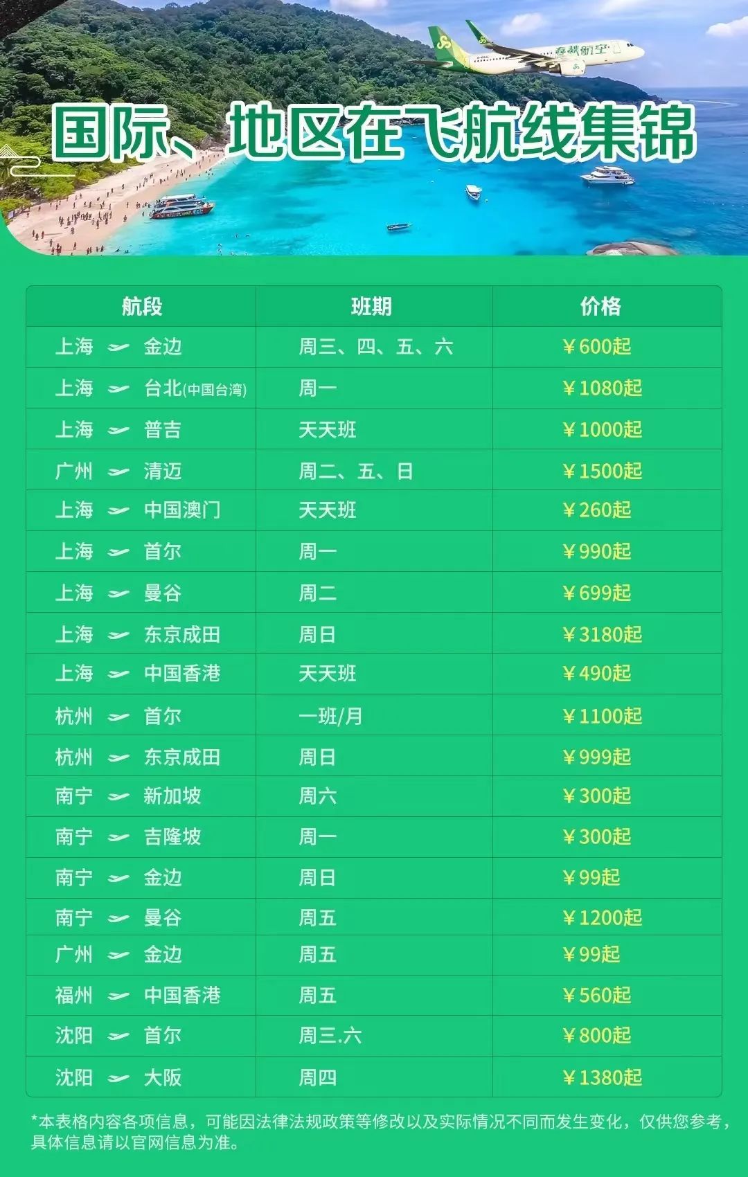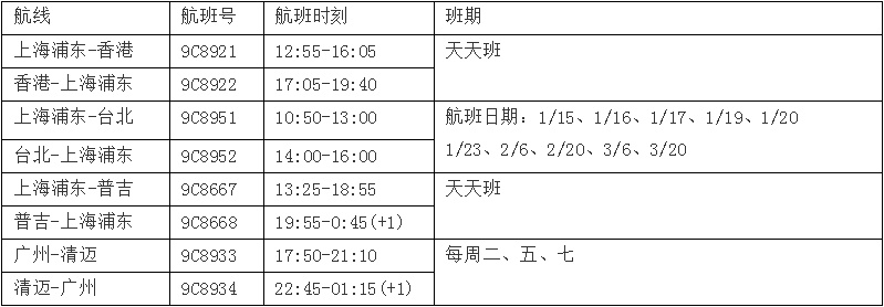 据了解,春秋航空目前执飞的国际及地区航线有18条,包括中国香港、中国澳门、中国台湾、韩国首尔仁川、日本东京成田、日本大阪关西、泰国曼谷、泰国清迈、泰国普吉、柬埔寨金边、马来西亚吉隆坡、新加坡等国际及地区航线。其中,上海浦东至香港航线将于1月14日起恢复,单程最低票价490元起;上海浦东至台北航线于1月15日起恢复,单程最低票价1080元起;上海浦东至普吉航线于1月18日起恢复,单程最低票价1080元起;广州至清迈航线也将于1月18日起恢复,单程最低票价1500元起。