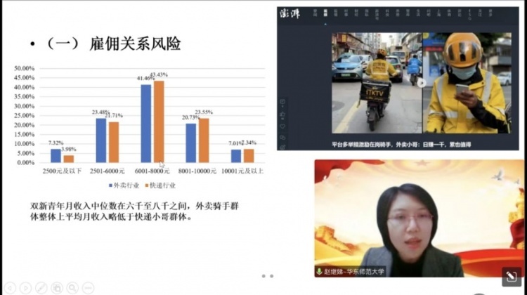 据了解,青年群体是外卖骑手、快递配送员、闪送员等新业态、新就业群体的重要组成部分,然而现实情况是,该青年群体面临着较高的职业风险。为此,区团委和华东师范大学公共管理研究团队于去年联合开展了浦东新区新业态、新就业青年群体职业风险评估的专题研究。活动上,华东师范大学公共管理学院副教授赵继娣代表课题组汇报了《浦东新区新业态、新就业青年群体职业风险防范化解及权益保护研究——以快递、外卖从业青年为例》的调研情况。