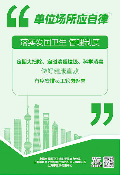 各级单位应自律 各级各类单位应当自律维护环境健康,落实单位爱国卫生管理制度,定期开展单位卫生大扫除活动,保持内外环境整洁、有序;食堂、厕所和垃圾箱房定时清理、科学消毒。关心员工身体健康,做好社会健康宣教,有序安排轮岗、返岗。