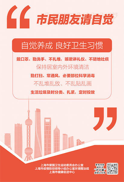 市民朋友请自觉 请广大市民朋友要强化公共卫生安全意识,自觉养成良好卫生习惯,戴口罩、勤洗手、不扎堆,咳嗽讲礼仪、不随地吐痰,积极开展卫生大扫除,保持居家清洁、居室通风,必要部位科学消毒;楼道等公共部位不乱堆乱放、不乱贴乱画;生活垃圾及时分类、扎紧,定时投入垃圾箱房。