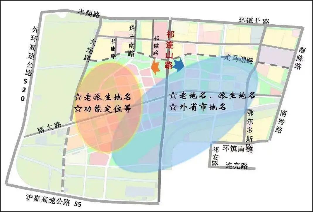 通过调研,编制单位在宝山区规划资源局和相关部门的配合支持下,对南大地区的人文地理实体名称的形成、演变、发展、布局有了充分了解,并结合控规对南大地区的目标定位,对整个区域进行地名片区划分,明确祁连山路以东区域道路专名以老地名和外省市地名采词为主;祁连山路以西区域则结合功能定位在派生地名基础上增加了用地功能采词等采词方式,最终形成了地名规划方案。