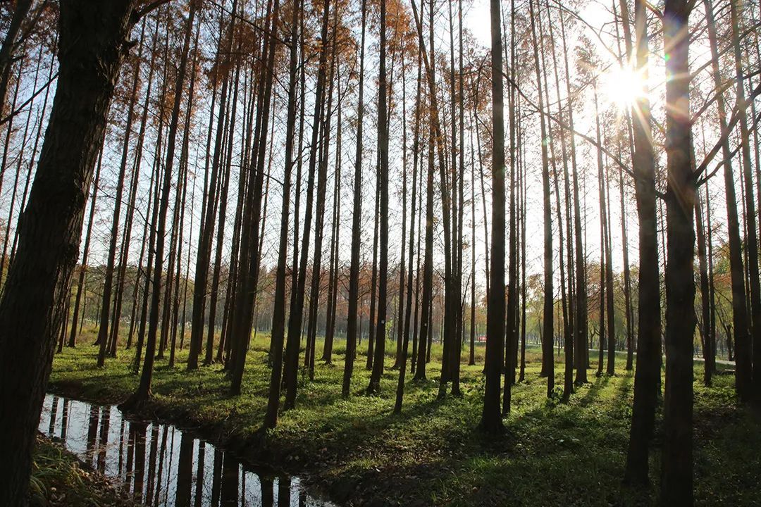 在此次改造中,园方以保护利用原外环林带生态本底风貌为原则,在公园整体布局上,构筑形成“一环、一廊、三节点”的空间格局。其中“一环”为1公里郊野绿道慢跑体验环;“一廊”为紧邻中槎浦的河畔休闲长廊;“三节点”即利用现状水系资源,围绕“杉”水特色,以原有水杉为依托,栽植红豆杉、蓝杉、池杉、墨西哥落羽杉等2000余株,形成杉类特色观景区,打造杉林秘径、曲径清溪、湖光乐动3个景观点。