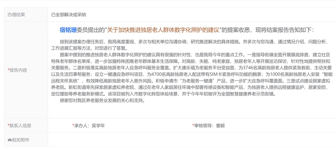 不仅如此,其后续回复中又陆续更新了建立社区特殊老年群体名单库、落实高龄独居老年人应急呼叫服务全覆盖、为1000名高龄独居老人安装“智能远程关怀系统”等诸多举措。