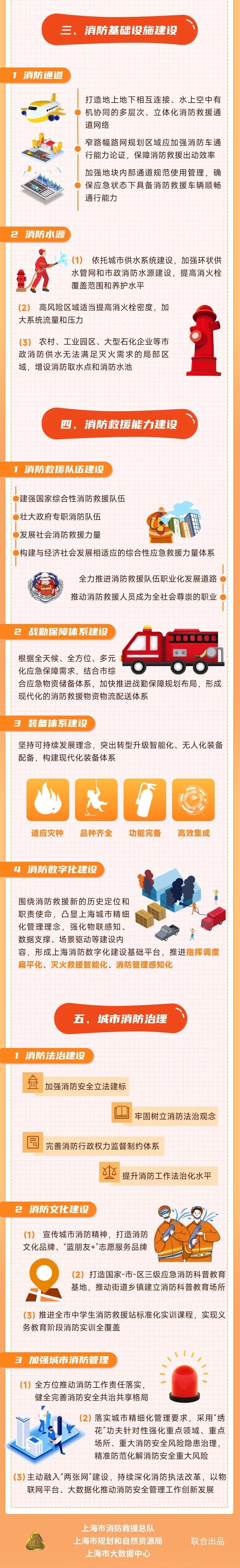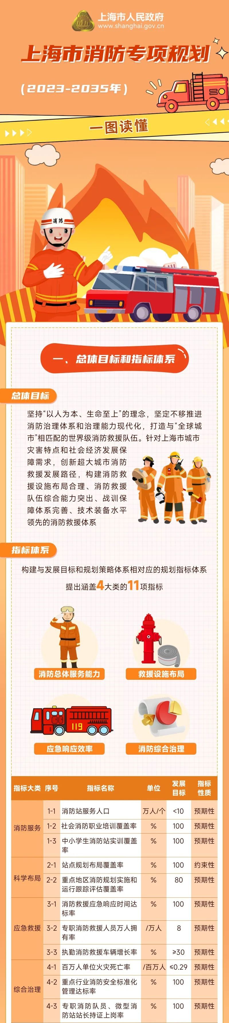 上海市消防救援总队介绍,《上海市消防专项规划(2023-2035年)》近期已经市政府批复(沪府[2022]63号)正式发布。《规划》提出:到2025年,推进消防基础设施建设,提升重点发展地区的消防救援安全保障能力,使本市消防救援总体水平继续保持国内领先。到2030年,基本建成较为完善的消防安全管理体系和区域风险评估与安全维护体系,使本市消防总体水平接近全球城市先进水平。到2035年,消防救援站点部局合理,市政消防水源实现全覆盖,城市消防管理智能化,消防安全治理体系完善,本市消防救援总体水平达到全球城市先进水平。更多规划要点详见图解↓