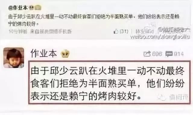 2015年,在邱少云牺牲60余年后,加多宝官方微博与@作业本 一起,挑起刺痛舆论场的“烧烤”话题,开展恶意营销,引发公众愤怒。这一可耻之举让英烈家人无比震惊。
