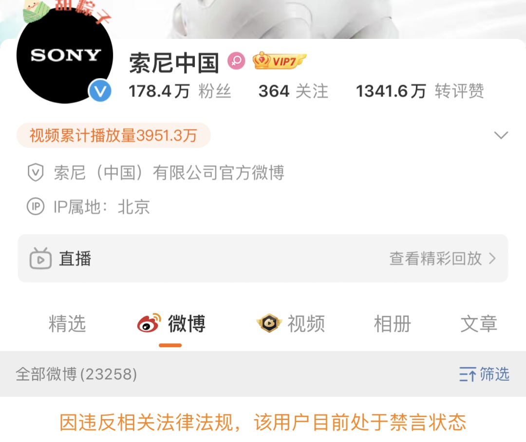 1月4日晚间,认证为“索尼(中国)有限公司官方微博”的账号@索尼中国被禁言,被禁言的具体原因,微博方面暂未给予说明,索尼中国账号页面则显示,“因违反相关法律法规,该用户目前处于禁言状态”。在被禁言前的数个小时,索尼中国仍持续更新动态,目前该账号处理已生效。