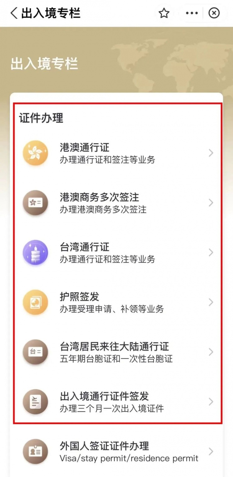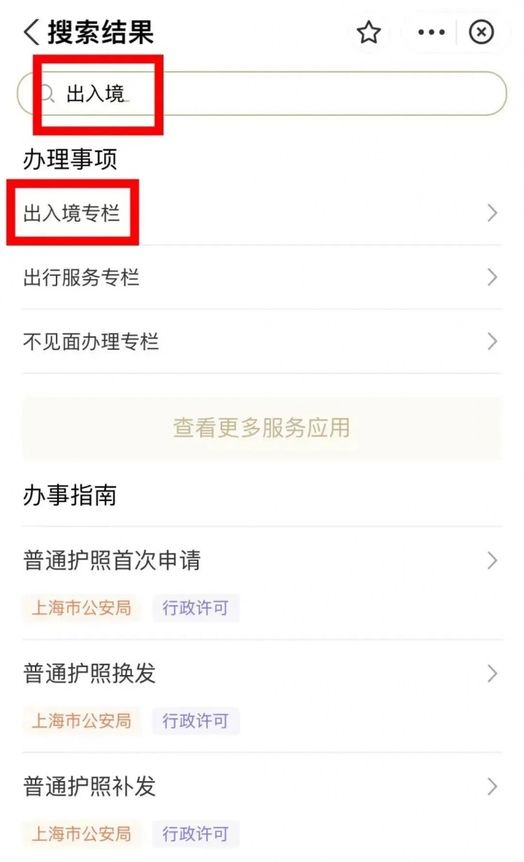 申请人通过支付宝、微信进入“随申办”小程序,点击上方搜索栏,搜索“出入境”,点击下方“出入境专栏”。