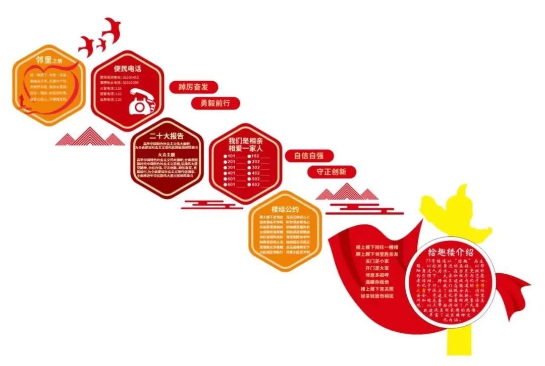 在小区党组织的引领下,大家积极参与志愿者活动,将雷锋精神与文化内化于心、外化于行。在楼道的宣传之窗中设立了垃圾分类、消防安全、党建文化等板块。邻里间和睦友善,楼道环境整洁美观,以点带面调动了广大居民建设美丽家园的热情,丰富了社区精神文化内涵。