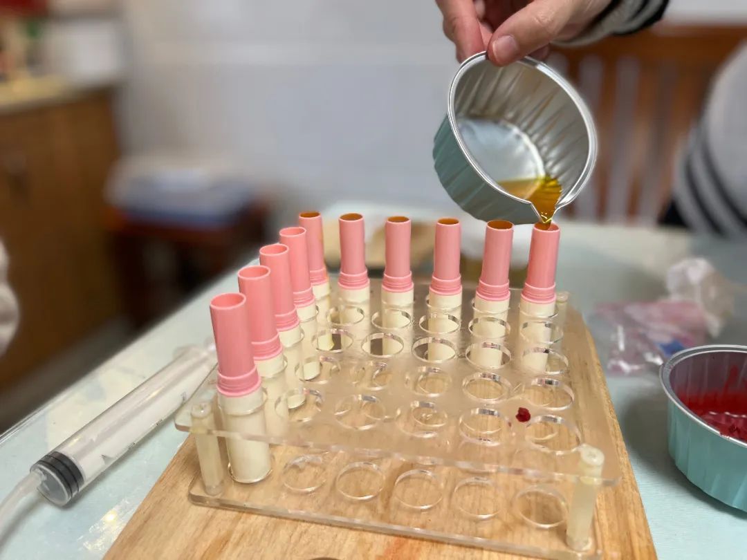 液体倒入模具,然后选一个自己喜欢的口红管,等到完全冷却,就可以脱模了。脱模的时候一定要小心谨慎,最后扣入口红管,一支美美的纯天然自制口红就完成了!