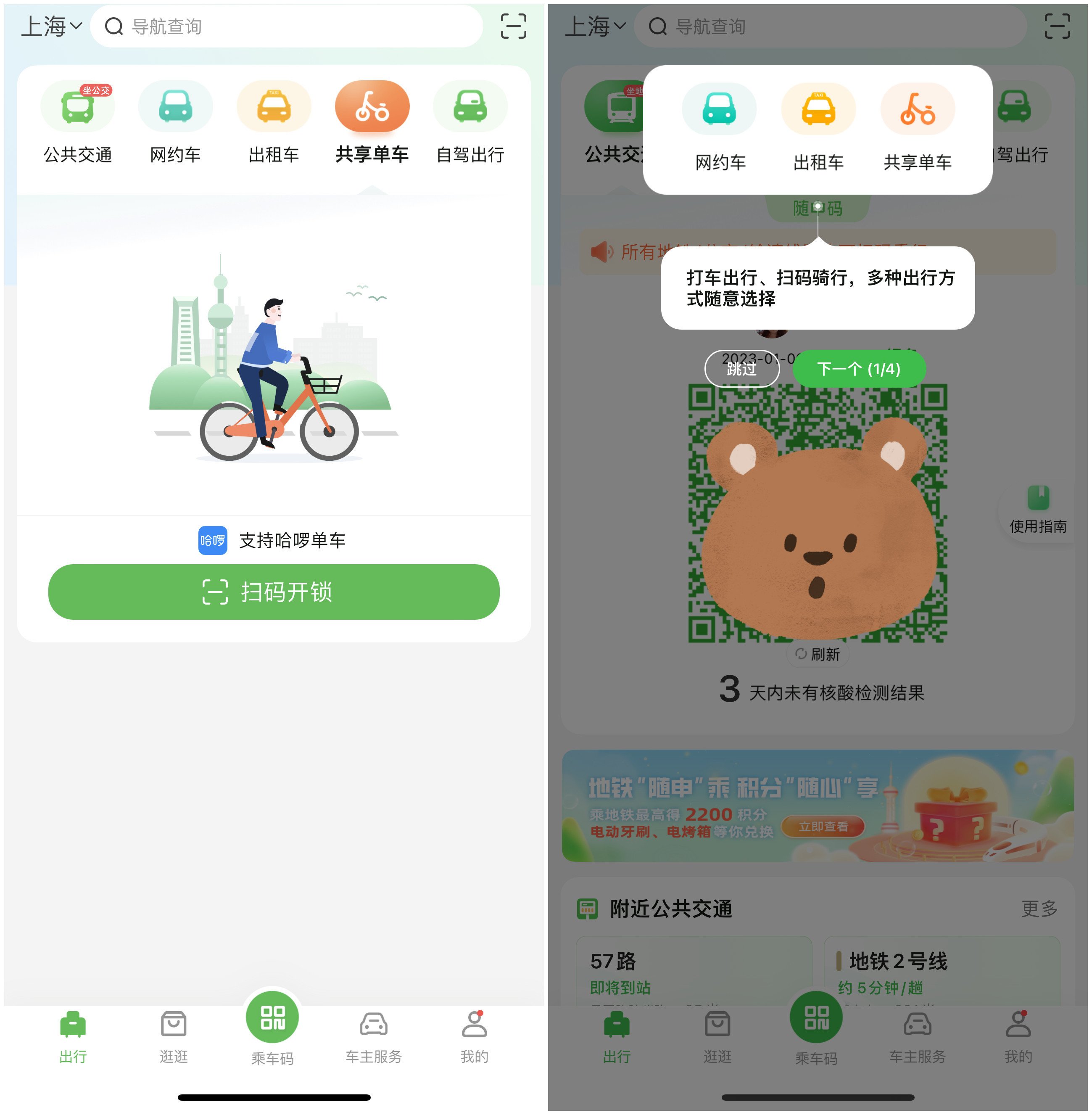 “今天打开‘随申行’App,意外发现用这个APP还可以骑共享单车、叫网约车!”近日,上海市绿色出行一体化平台“随申行”App正式启动2.0试版本运营。同时,其新增“共享单车”、“网约车”等服务功能,市民只需在“随申行”App界面点击“扫一扫”功能,便可扫描共享单车,享受绿色出行。