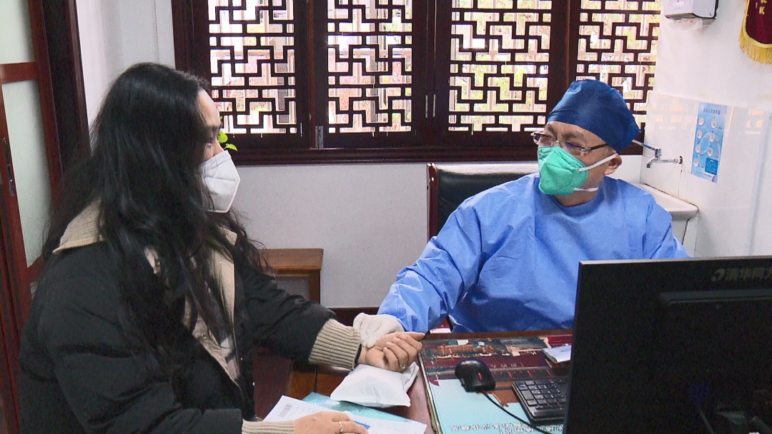 在高新区社区卫生服务中心的中医堂,退休返聘的中医董永庆正在为陈女士把脉问诊。