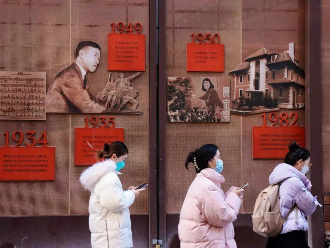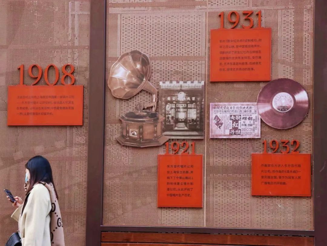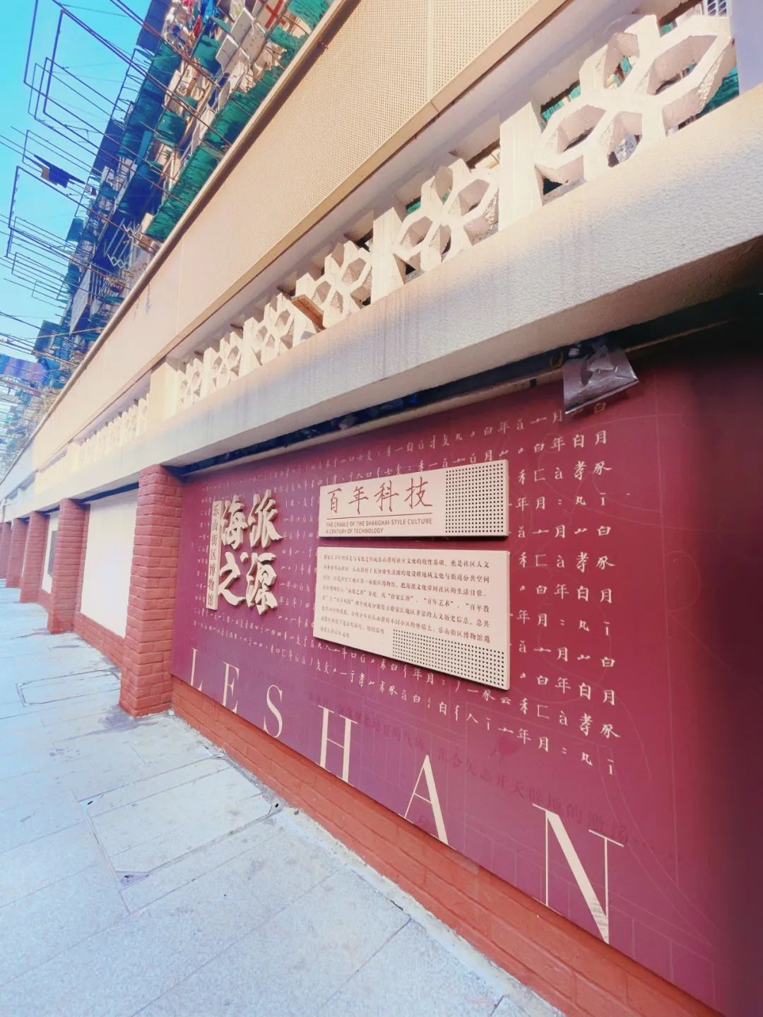 沿着乐山路慢慢走、慢慢看,沿途的红墙是一处开放的街区博物馆,一块块展板图文并茂,讲述着徐家汇发展的百年故事。