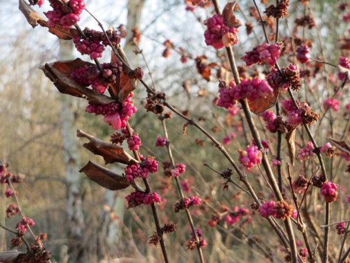 已是隆冬的“三九”时节,今年是个冷冬年,树上又是一片空秃。在这萧索的冬日里,有这么一种植物,它的枝头挂着鲜艳的紫红果实,在冬阳的照耀下,果实发出珍珠般的光彩,格外醒目,为大地增添了几分生气,这就是有雪果之称的圆果毛核木。