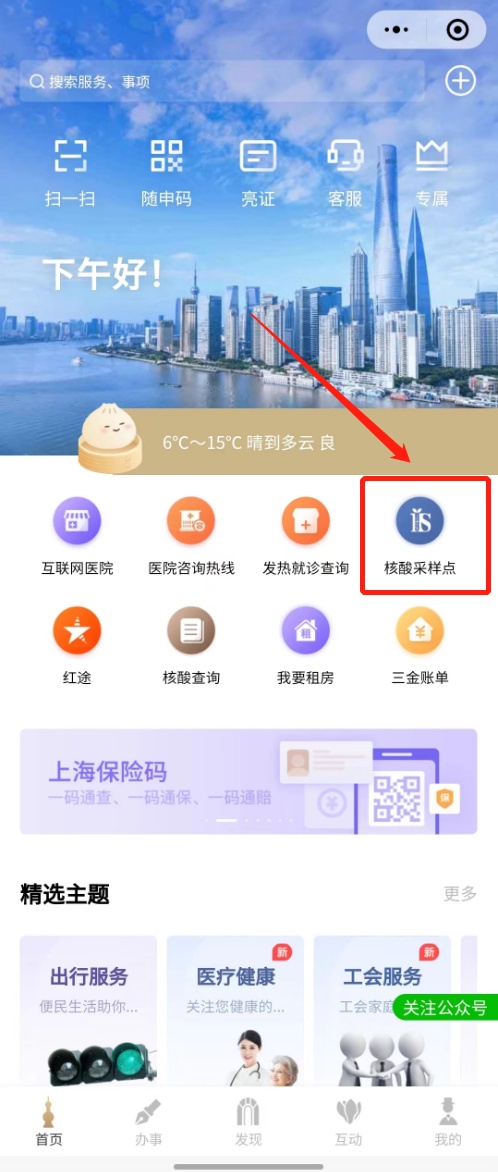 打开“随申办”微信小程序、“随申办”APP、“上海明起核酸检测不再免费;这些新冠治疗药品都能进医保→随申办”支付宝小程序,首页点击【核酸采样点】运营位进入。