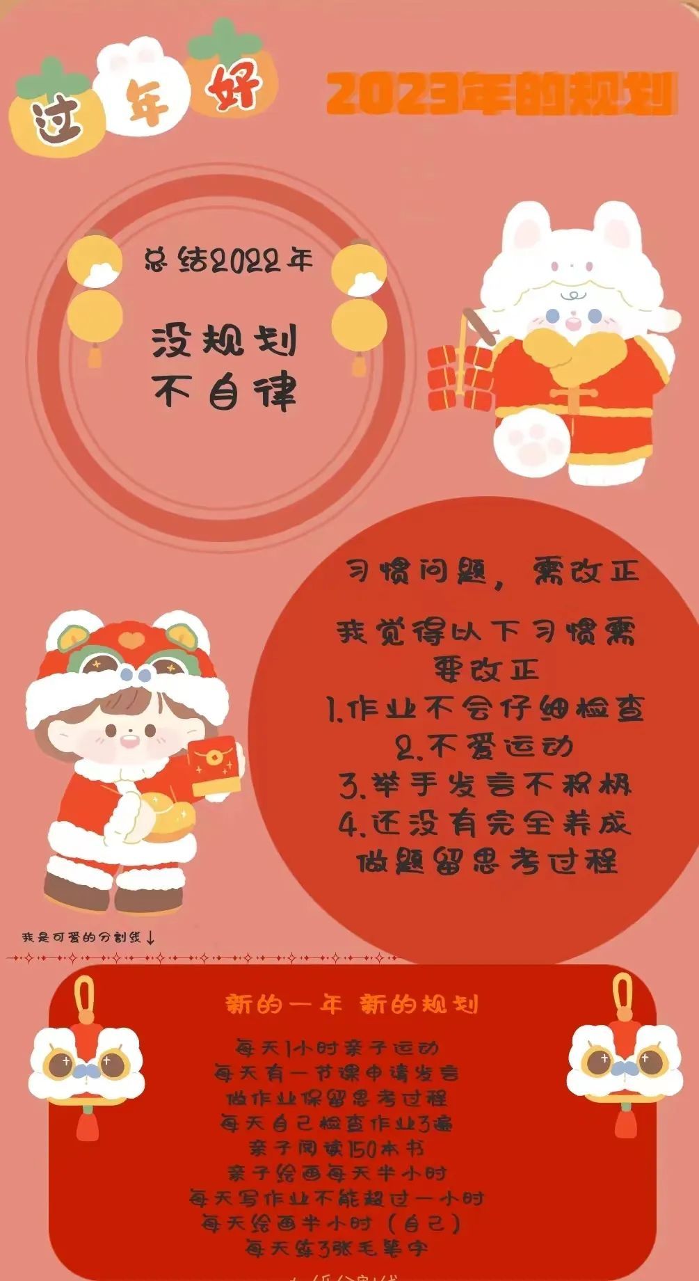 其次,在“好习惯清单”的指导下,孩子们和家长可以针对具体情况,根据孩子自身的薄弱点确立自己的2023年习惯养成小目标,并将其具体化。比如下面这份好习惯清单: