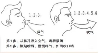 2、缩唇呼吸:患者采取放松姿势,坐位或平卧,紧闭嘴唇,用鼻子慢慢地、深深地吸气;呼气时嘴唇轻闭,中间张开像吹口哨慢慢呼出气体。
