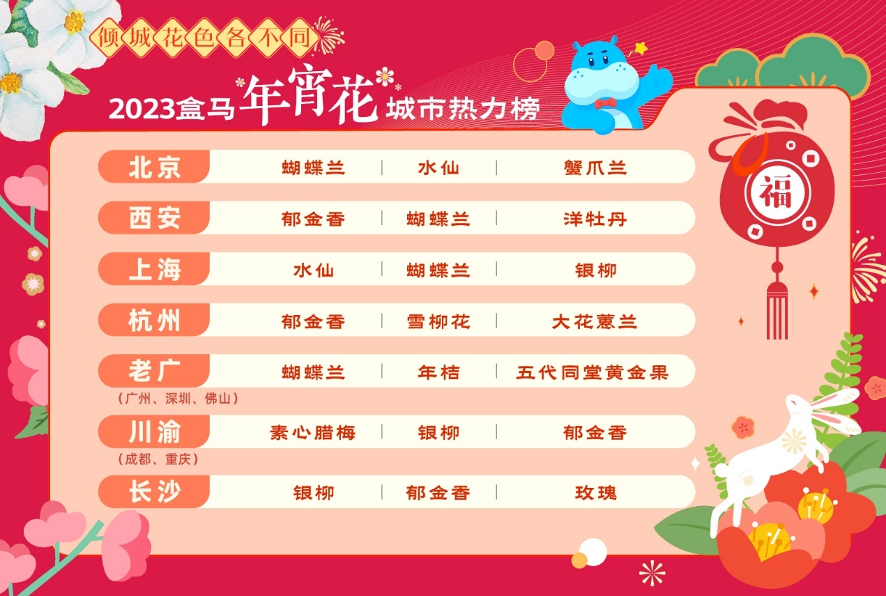 距离春节还有不到两个星期,申城年宵花的热销大幕正式拉开。今年上海人都爱买哪款年宵花?据盒马近日发布的《2023年宵花城市排行榜》显示,水仙是上海人的年宵花心头好。现在正逢水仙大量上市,到春节前后正好迎来花期,可以给家里带来浓浓年味。
