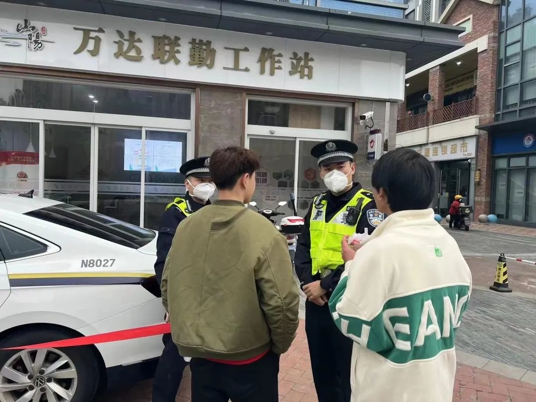 公安金山分局经侦支队民警姚驰、蒋涛在金山万达巡逻期间遇群众报案。