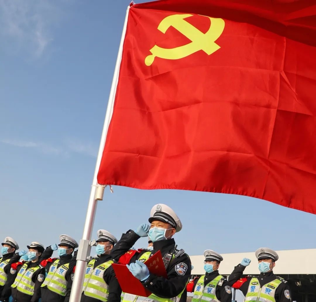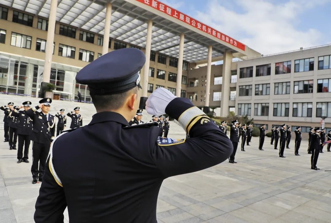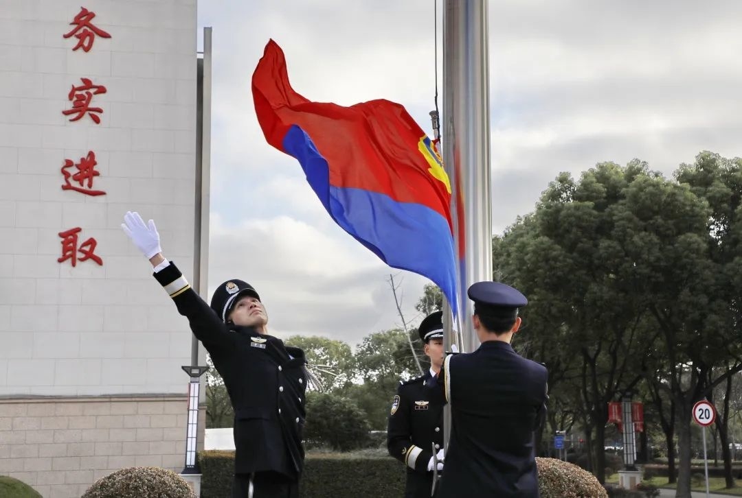 9时,升旗仪式正式开始。伴随着豪迈的中国人民警察警歌,红蓝两色警旗徐徐升起,全体民警面向警旗庄严敬礼,高唱警歌。随后,面向警旗重温入警誓词,铿锵有力的宣誓声响彻全场。