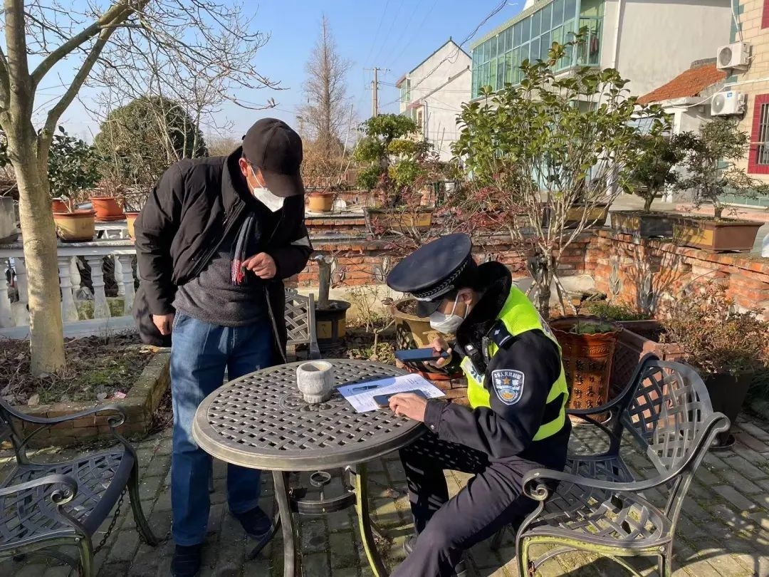 公安金山分局漕泾派出所民警俞旭飞在辖区开展警情回访工作。