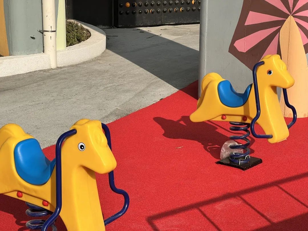 中山北二路政本路路口,内环高架桥下方的施工区域已不见工人师傅的身影,取而代之的是崭新的公共空间面貌。路口石雕上“蘑幻森林”几个大字,还有篮球场、平衡木、健身器械、摇摇木马……吸引着过往市民停下脚步。作为东走马塘滨水一畔的公共空间,这里适合全人群休闲娱乐。