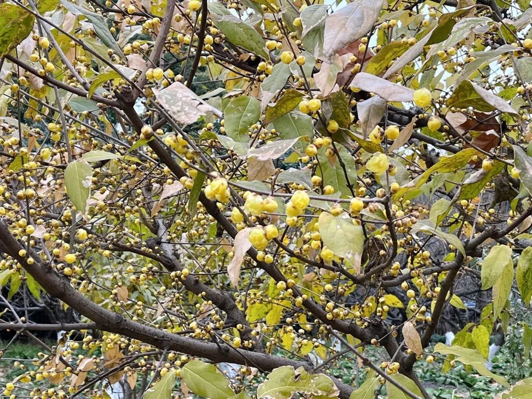 目前,方塔园的蜡梅已经悄然开放,冬季限定的“暗香”已上线。园内蜡梅主要分布在北大门入口、塔东面、厉廉堂旁,今年因温度原因,蜡梅花叶果同挂枝头,许多树叶和果实还来不及凋落。