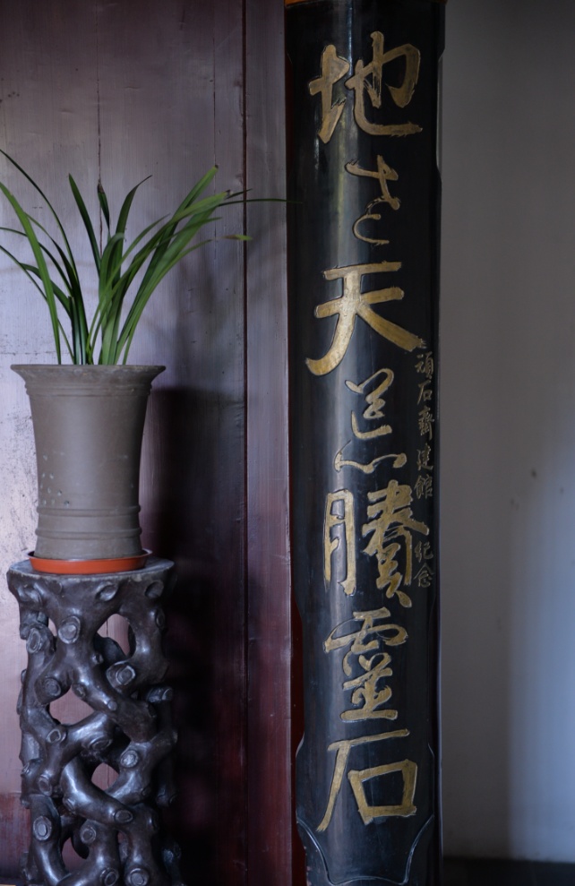 (“地老天荒胜灵石,山明水秀有畸人”,顽石斋内抱柱楹联,1994年刘旦宅书)