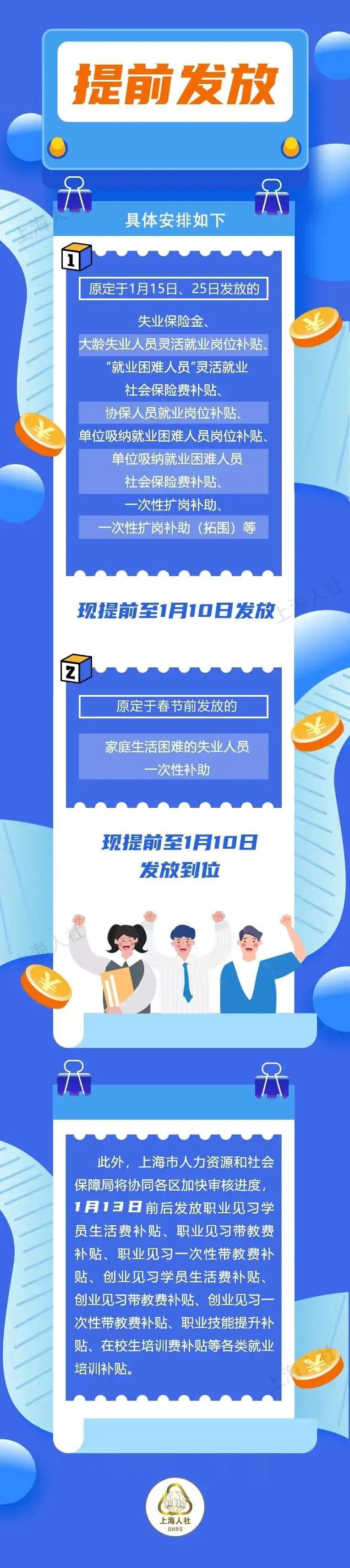 为了让失业人员、就业困难人员等劳动者和相关用人单位度过一个愉快祥和的春节,上海市人力资源和社会保障局将于1月10日起提前发放1月失业保险待遇补贴及各类就业培训补贴。