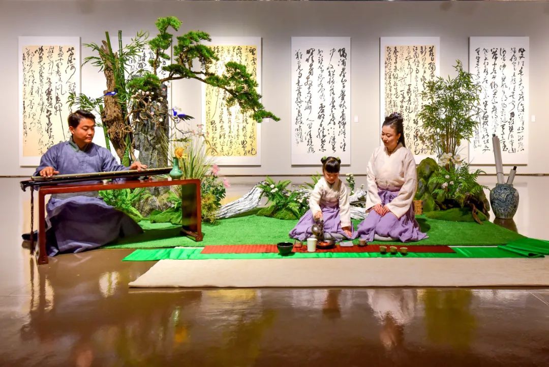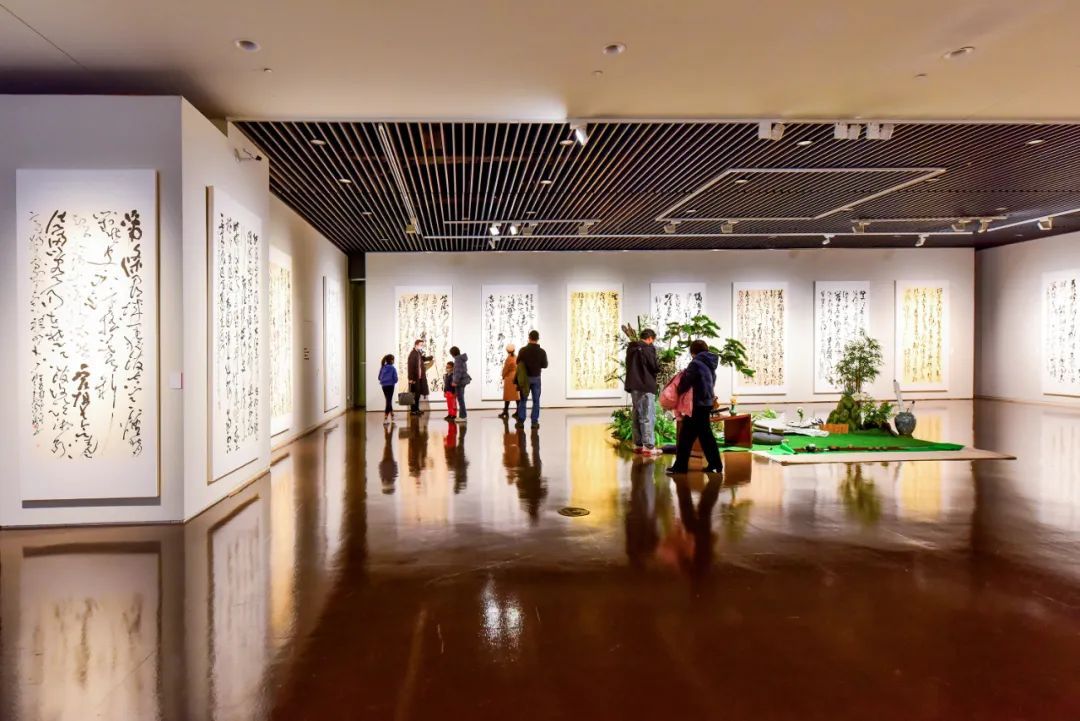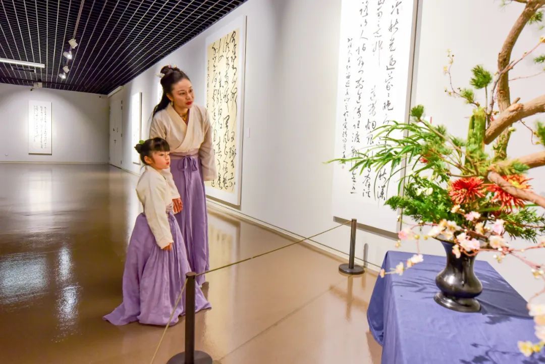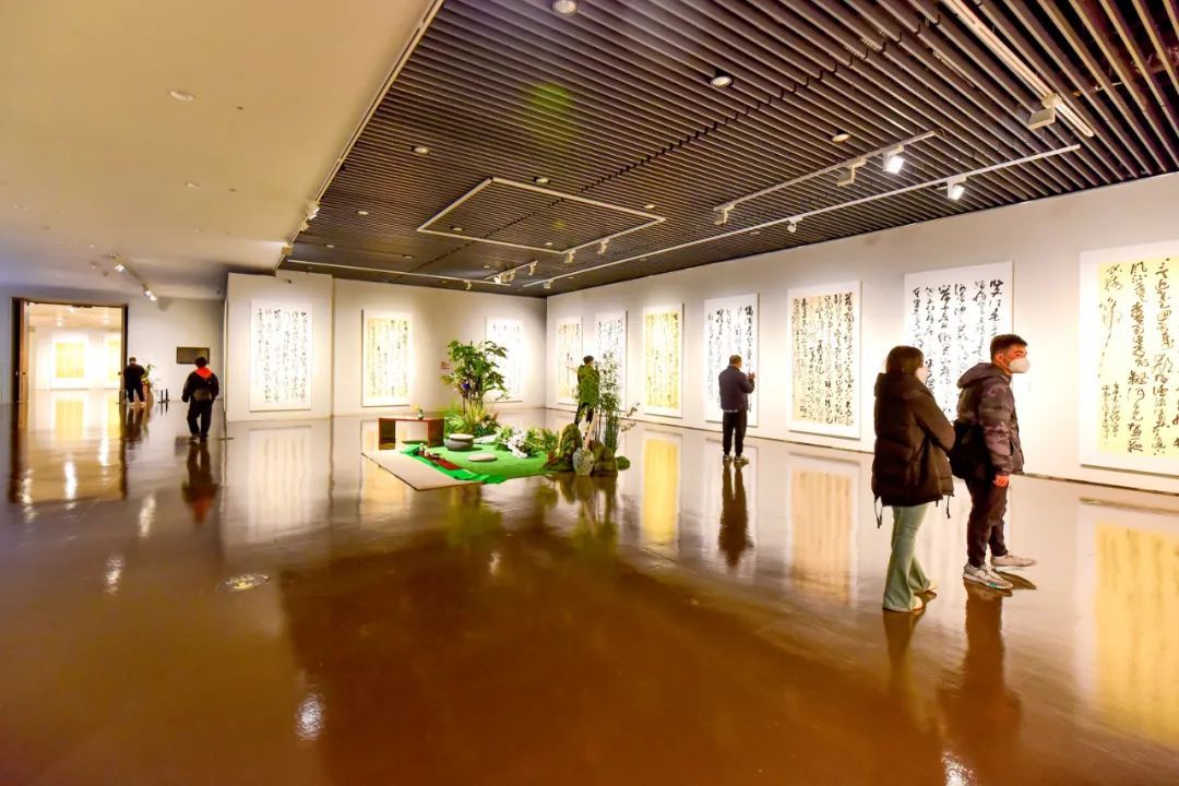 在中华艺术宫巨大的展陈空间中,所有入展作品展框高度一致,以统一的视觉呈现让作品内质更加突出。在空间氛围营造上,将花道引入展览空间,力求还原传统文人生活美学的场景。