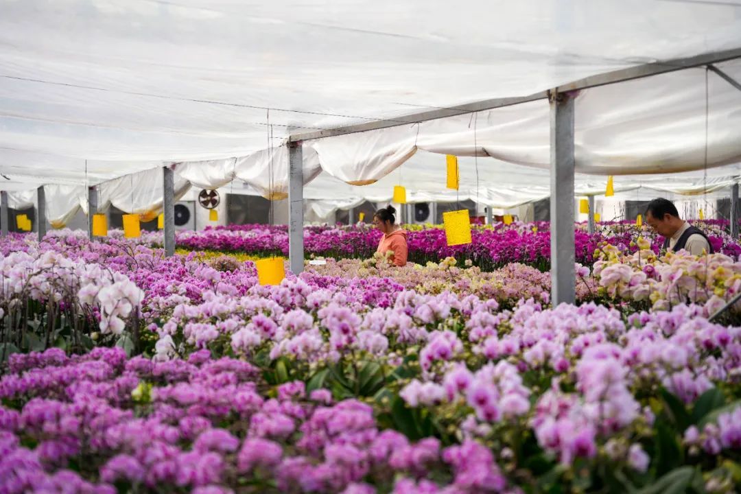 推开基地智能温室的大门,只见白色、粉色、玫红色的蝴蝶兰好似一只只蝴蝶伫立枝头、展翅欲飞。不同花色的蝴蝶兰在花农的精心呵护下显得生机勃勃。