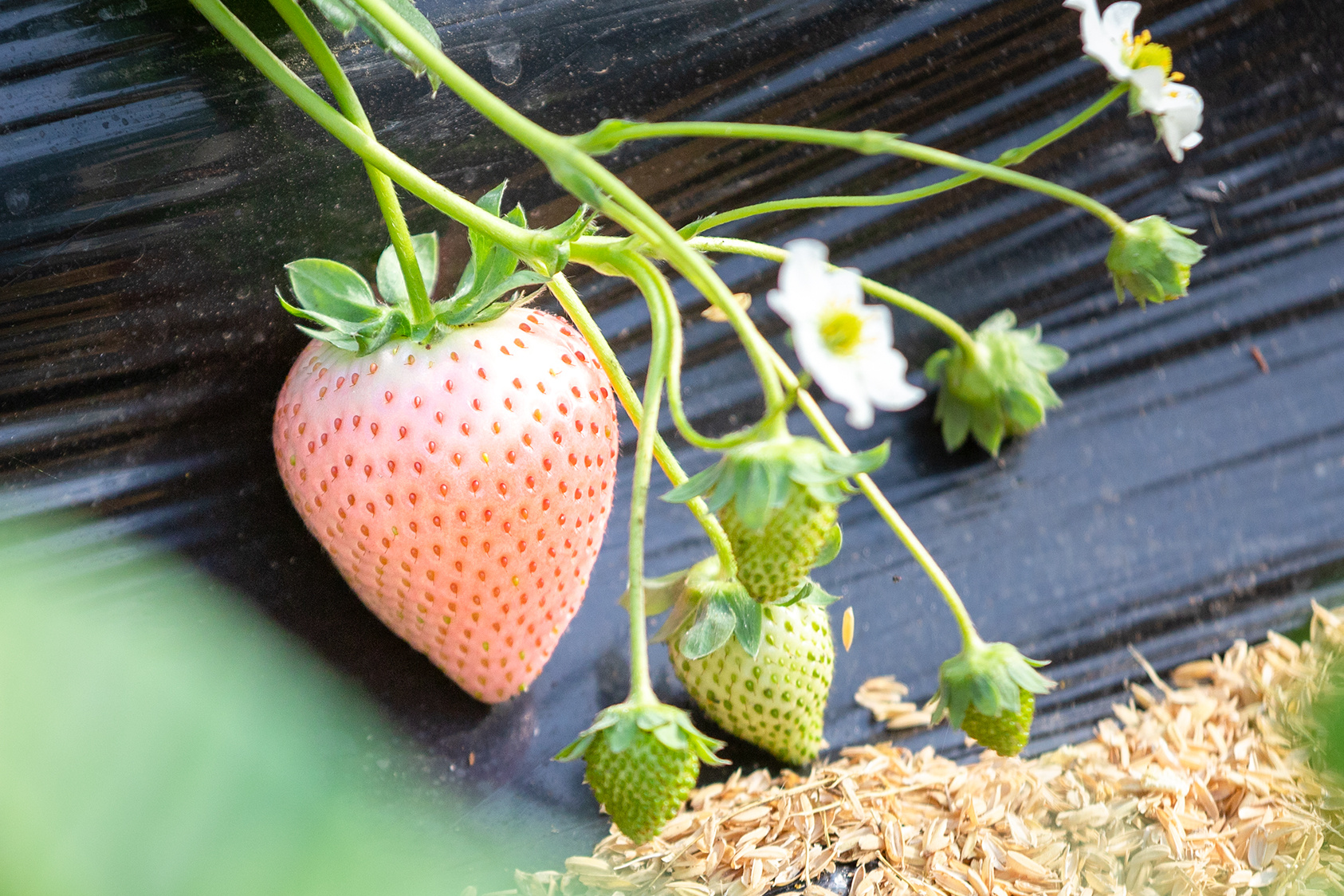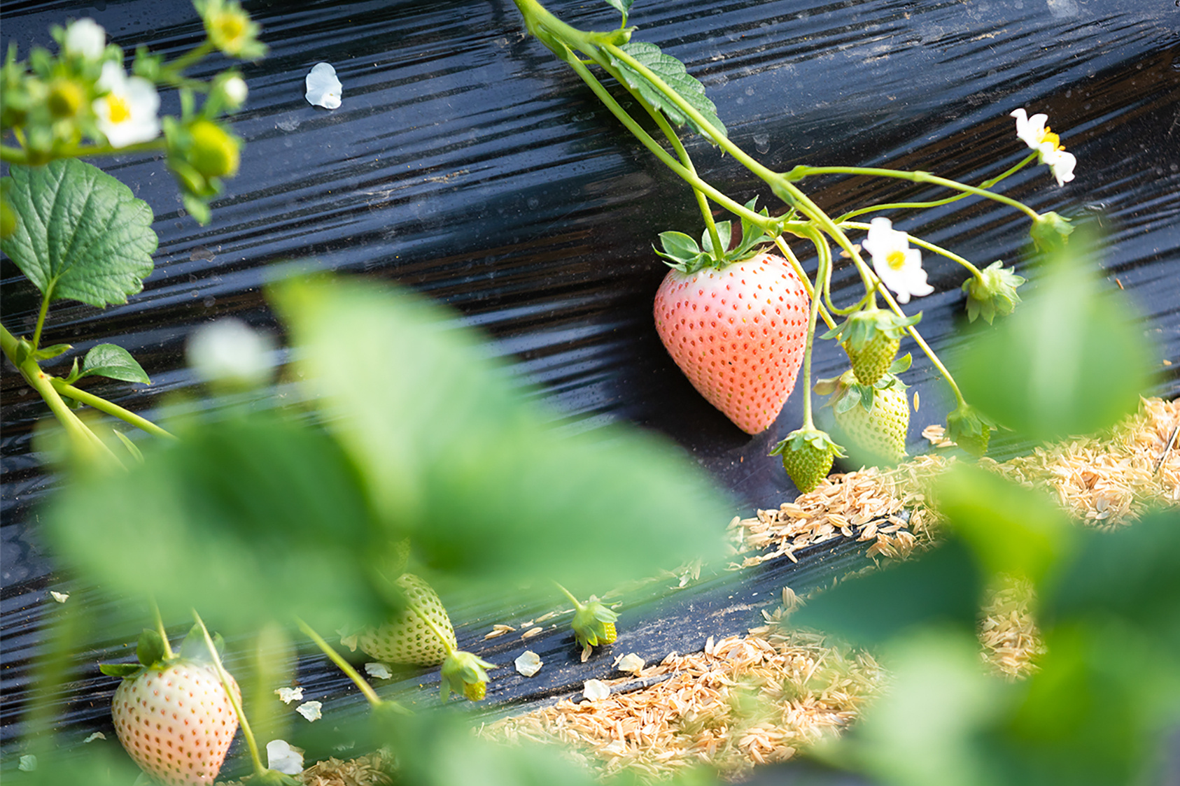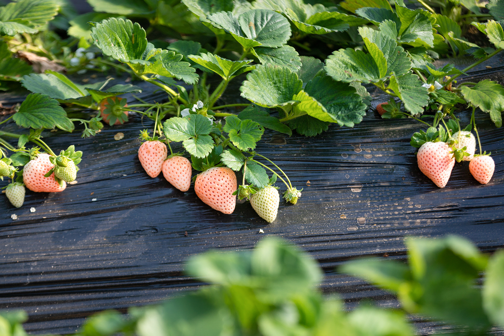 腊月里草莓红,正值采摘好时机。来到济南唐王街道东八户村的稷合农场,眼前的草莓大棚一个连着一个。随便进入一个大棚,碧绿叶下的草莓有红有白,煞是可爱。(大众日报客户端记者 杨润勤 报道 摄影 张宝贤)
