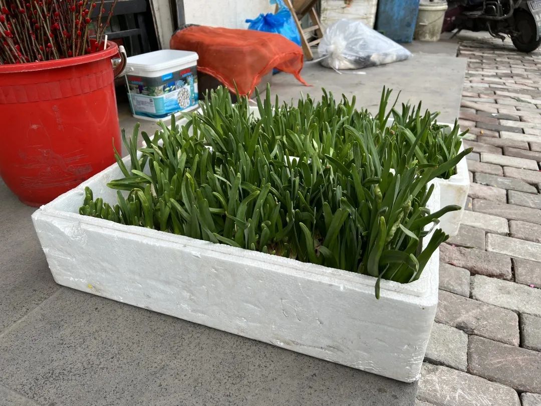 市民顾先生专程为了水仙而来,买了一颗6头花苞的,他说,最好挑还未开花的,带回家小心养护,养个两三周。期间,通过调整室温、湿度等,可以一定程度上控制开花的时机,“待水仙花开,就是过年。”