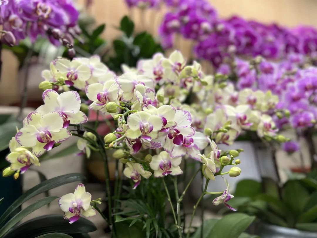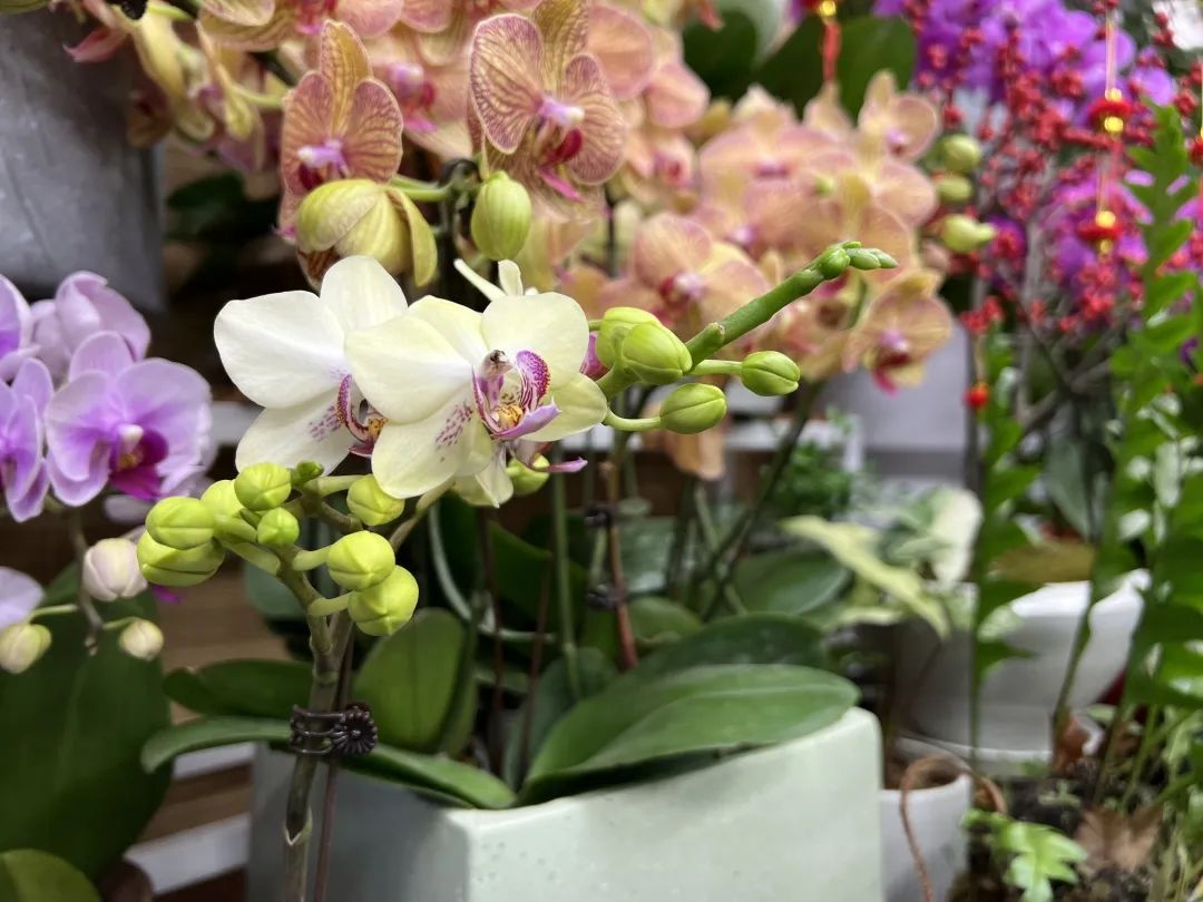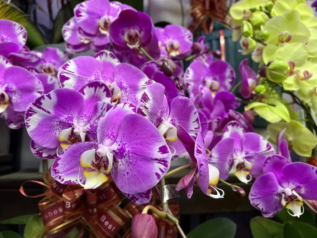 除了水仙,年宵花界的另一号“王牌”同样销路正热。蝴蝶兰被称为“君子之花”,花店店主说,需要天天进货才能保证供应。其中,标志性的紫红色蝴蝶兰名为“大辣椒”,分为不同规格,有的花开如成人手掌,有的仅瓶盖大小。其它如银白花片包裹着紫色唇瓣的,是绿雄;黄紫夹杂的、个头娇小的,是金蝶……纷繁多样,令人眼花缭乱。店主介绍,老年人一般偏爱传统紫红蝴蝶兰,年轻白领则爱买金色、粉色等异色品种。
