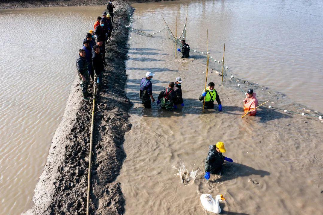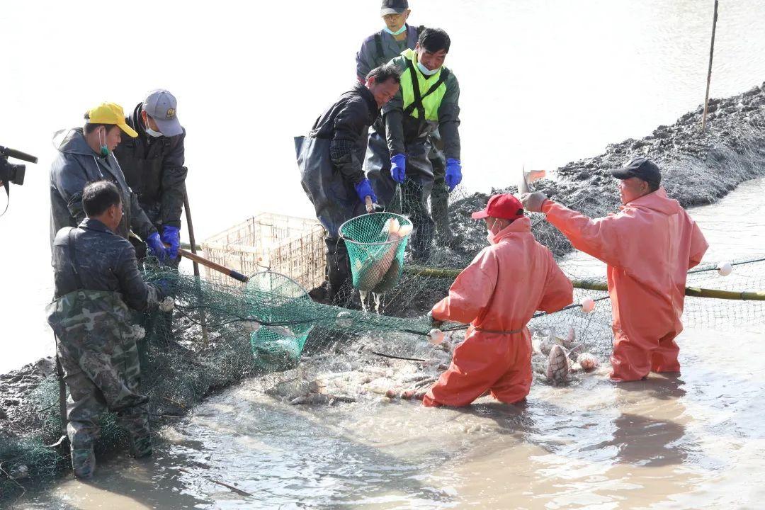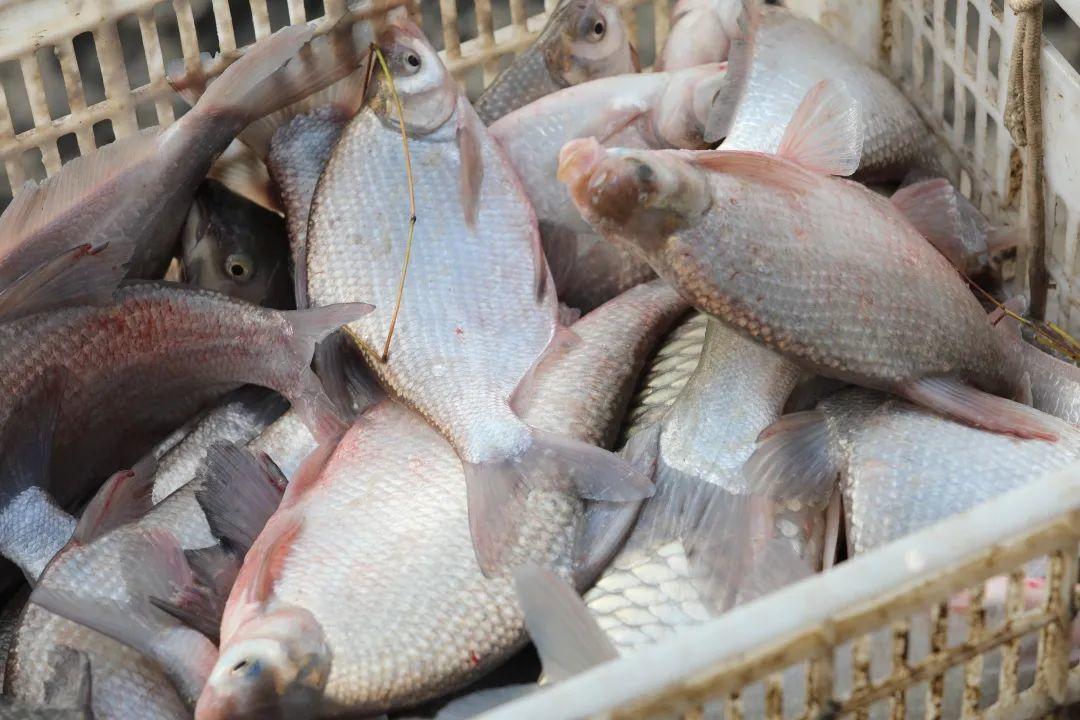 村民们一起配合着将渔网中的鱼捕捞上岸,分拣、装筐。捕上来的草鱼、鲫鱼、鳊鱼等共计约3.5吨。“通过精心喂养,鱼长得都越发好了,丰收了这么多鱼,新年一定能增添不少好运!”村民笑着说道。