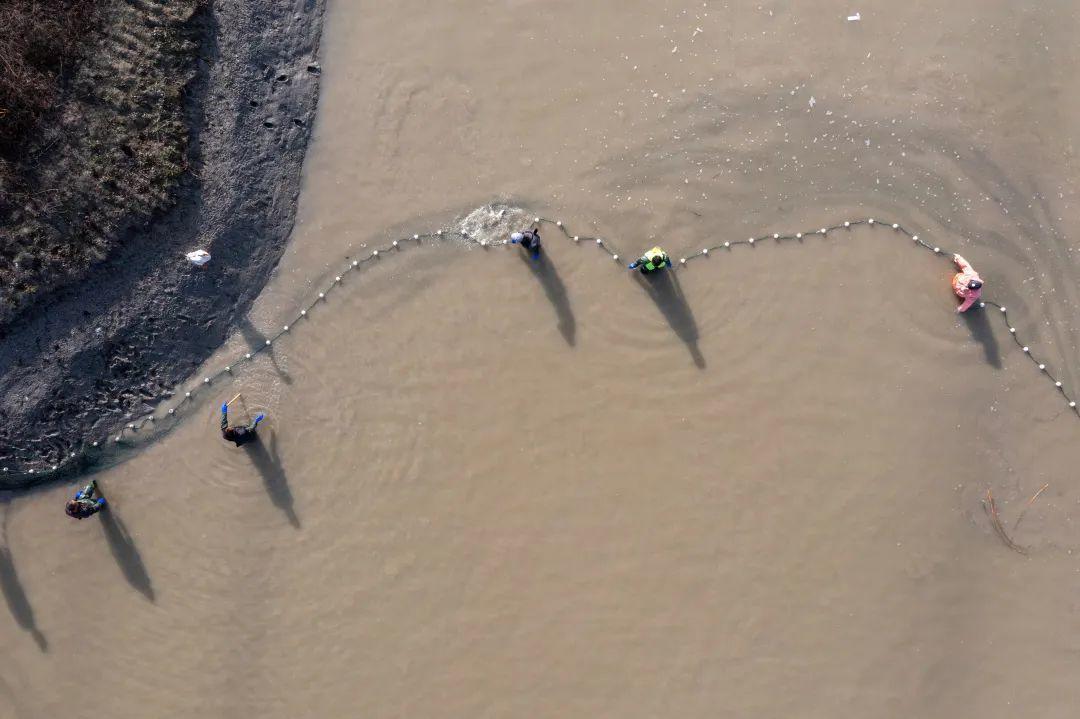 村民们身穿捕鱼皮衣,在抽干一半的鱼塘中,齐心协力一同拉开渔网,不一会儿,平静的水面变得浪花飞溅,肥美的鲫鱼、草鱼在网中打着滚,不断跳跃出水面。
