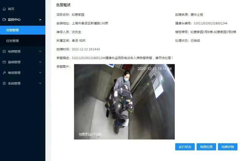 城运中心工作人员杨超勇表示:“目前,如意家园内46部电梯已经全部完成升级改造,能够识别电瓶车进行阻梯控制,并在客户端形成事件记录,同时这个功能对自行车、儿童车、轮椅等其他车类不受影响,只有当电瓶车进入时,系统才会发出提示。”