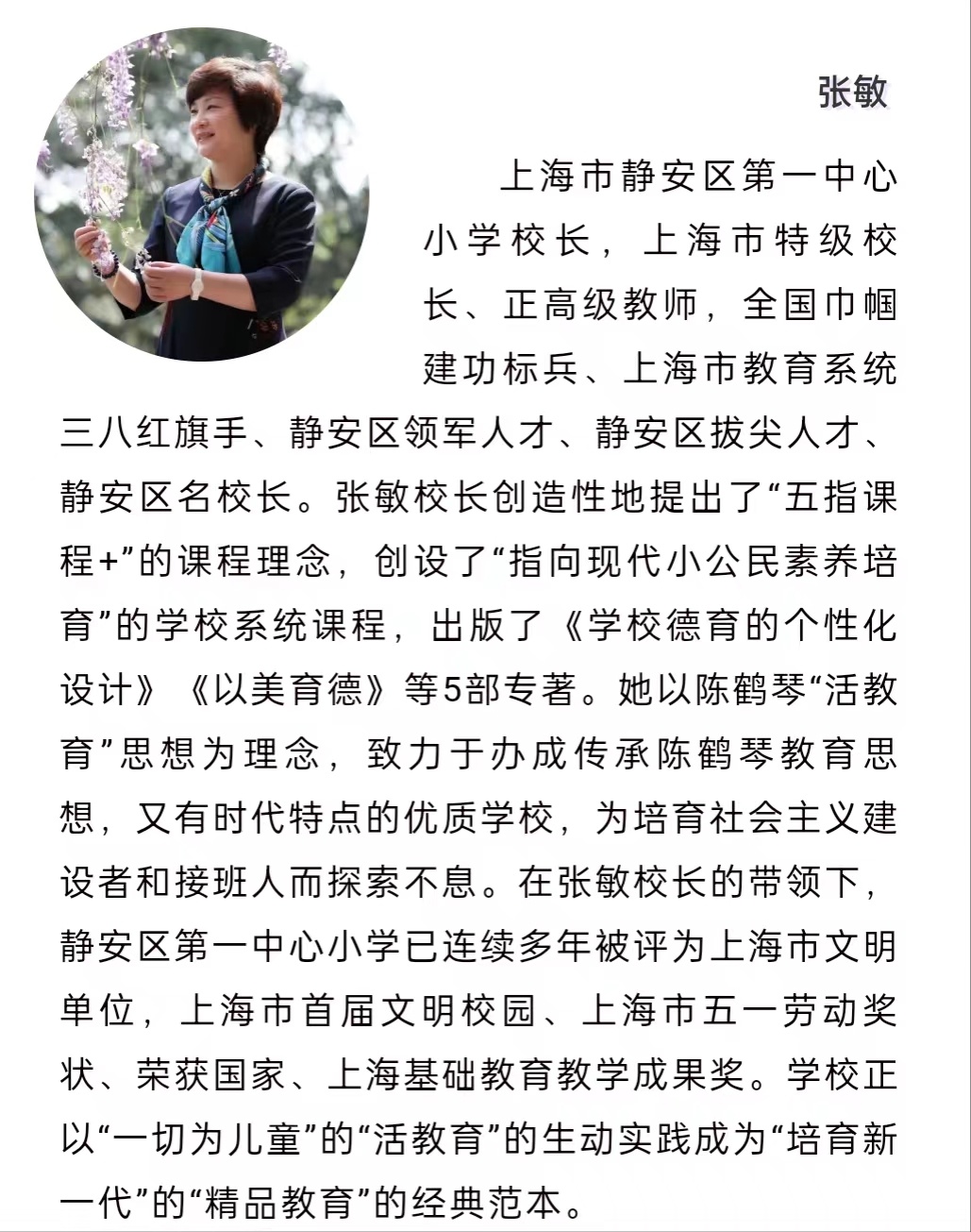 从万航渡路小学的“学会参与”,到上外静安外国语小学的“和谐育人”,再到如今静安区第一中心小学的守正创新,张敏的“校长之路”走得扎实、丰富。她继承着教育家陈鹤琴先生“一切为儿童”的教育理念,整体思考、系统规划,遵循“在传承基础上创新,在改革进程中发展”思路,擦亮老字号品牌,再创名校新辉煌。