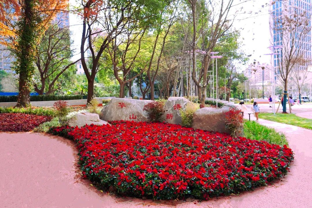 “华山新语”口袋公园在绿化景观打造方面运用了“四化”植物,强化色叶开花植物,打造时令观赏空间。通过种植“灵感”绣球、鸢尾、百子莲、大叶醉鱼草、金银花、“红花”绣线菊等季相分明的开花植物,营造“日移花色异”的四季景观。同时,细茎针茅、夹竹桃、早樱、枫香、娜塔栎等高矮不同、色相不一的植物互相穿插,丰富了植物景观在体量线条、色彩上的搭配形式。待到春暖花开时,这里繁多的植物品种、绮丽的色彩搭配以及错落有致的空间层次,将会充分激发口袋公园的活力和感染力。