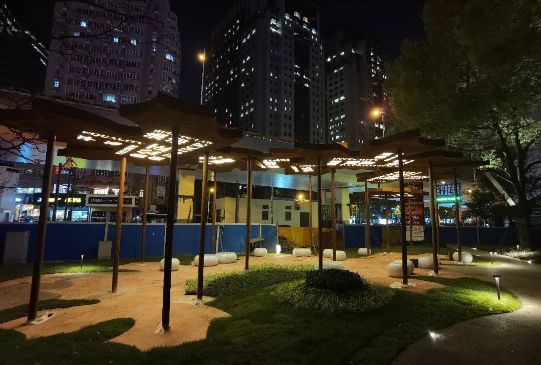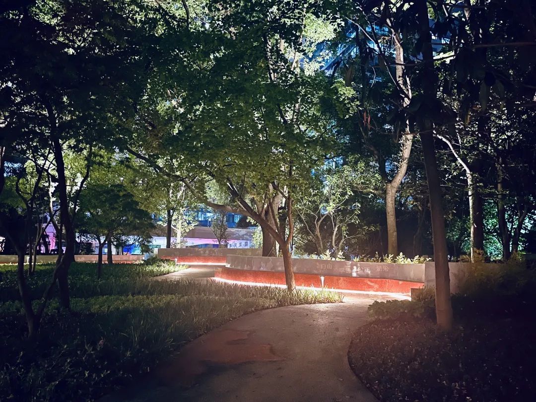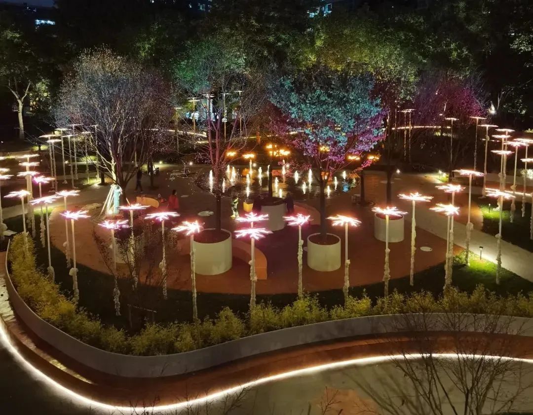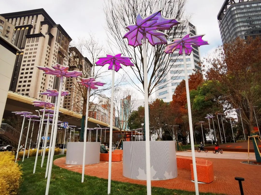 围绕公园一周,是一圈梧桐叶灯,白天它们像是一片片从树上飘零下的落叶,夜晚则变身为景观灯光,熠熠生辉,煞是好看。