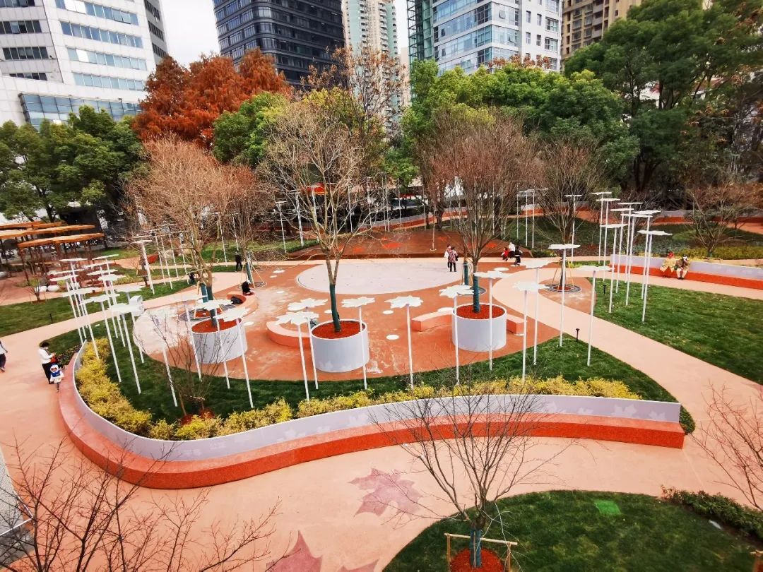 口袋公园以“知秋语”为寓意打造社会主义核心价值观的宣传景观小品,平面处理上以梧桐叶作为设计主题,并选择占长宁行道树种40%以上的梧桐作为主导树种,结合场地内保留的黄山栾树等营造橘黄色系的时令主题观赏空间。