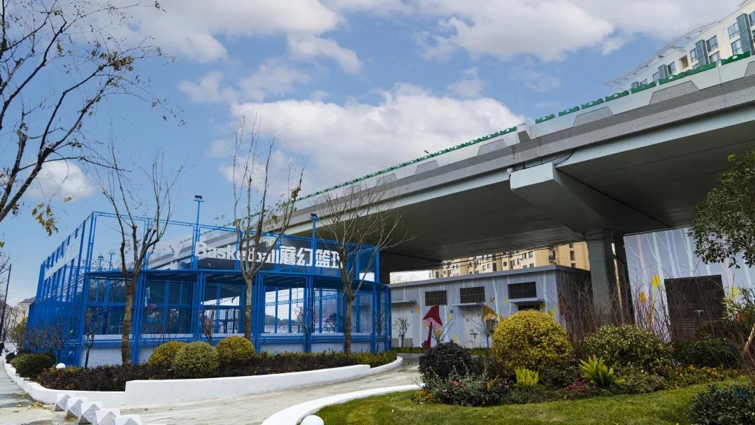一处开放式的“蘑幻森林”,拥有篮球场、平衡木、健身器械、摇摇木马……成为居民15分钟社区生活圈中的健身场所,适合全人群休闲娱乐。同时,这一区域还将东走马塘河畔打造成一条绿色慢行步道,实现了人车分流、坡道盲道覆盖、植被物种丰富,极大地提升了区域居住品质。
